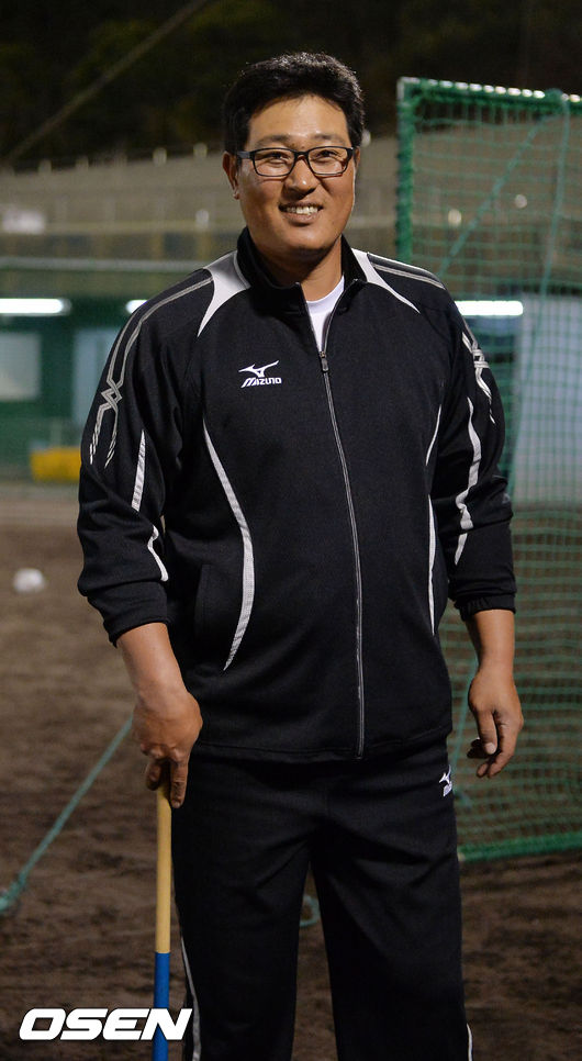 6일 일본 오키나와 고친다 구장에서 한화 이글스 2014 마무리 캠프가 진행됐다. 신경현 코치가 야간 훈련때 미소짓고 있다.