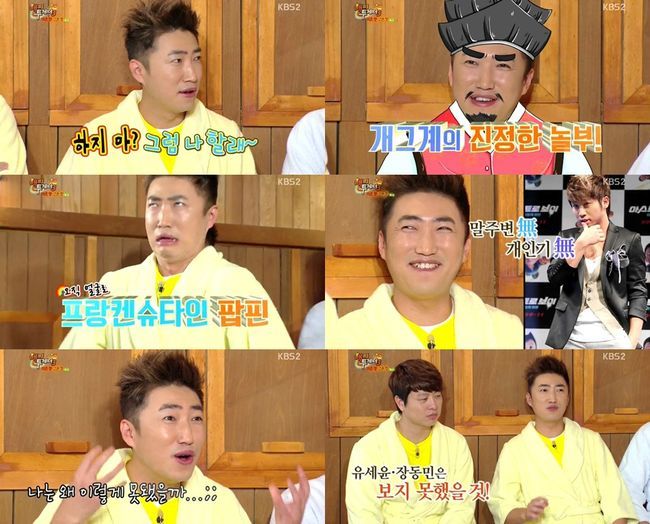 '뼈그맨'이라는 수식어답게 그는 간단한 표정만으로 스튜디오를 초토화 시키기도 했다. 김종민의 댄스 경연 대회 이야기를 시작으로 이어진 댄스 타임에서 그는 얼굴을 찌그러뜨린 채 '프랑켄슈타인 팝핀'으로 보는 이들을 폭소케 했다.