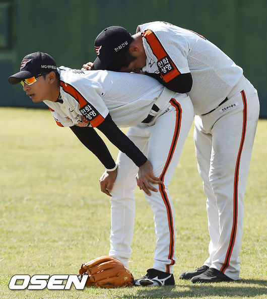 7일 오전 일본 오키나와 고친다 구장에서 한화 이글스 2014 마무리 캠프가 진행됐다. 정현석과 추승우가 펑고 훈련을 하며 숨을 고르고 있다.