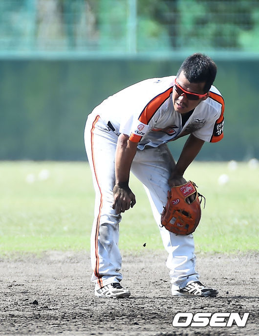 7일 오전 일본 오키나와 고친다 구장에서 한화 이글스 2014 마무리 캠프가 진행됐다. 정근우가 펑고 훈련을 하며 숨을 고르고 있다.