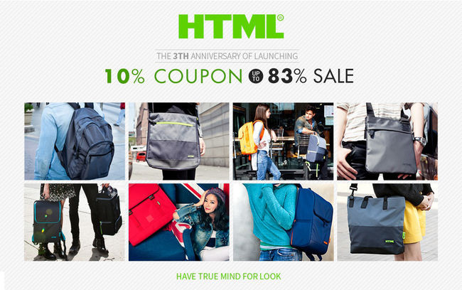 HTML은 론칭 3주년을 기념해 고객들의 성원에 보답하고자 온라인 쇼핑몰 가방팝과 멀티팝에서 오는 17일까지 10% 할인 쿠폰을 제공하는 이벤트를 진행한다. 또한 11월 한 달 동안 HTML 전상품 구매 시 크린토피아 세탁쿠폰을 제공하고 있고 최대 83% 할인 혜택도 만나 볼 수 있다.