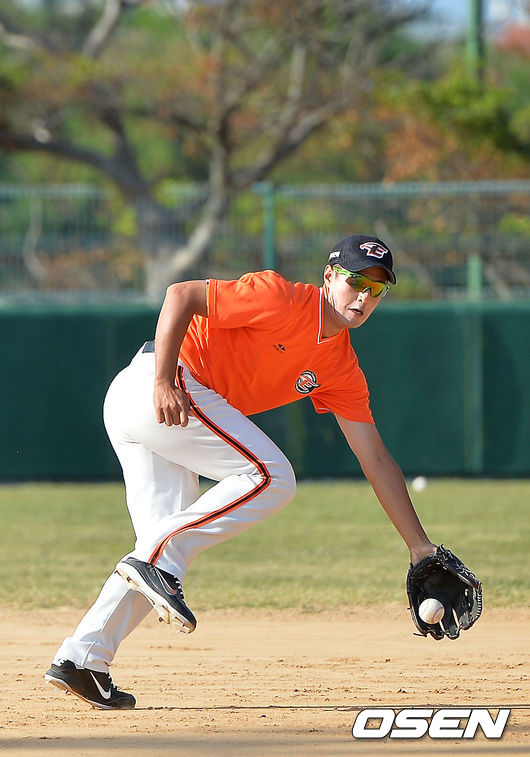 7일 오전 일본 오키나와 고친다 구장에서 한화 이글스 2014 마무리 캠프가 진행됐다. 윤규진이 펑고 훈련을 받고 있다.