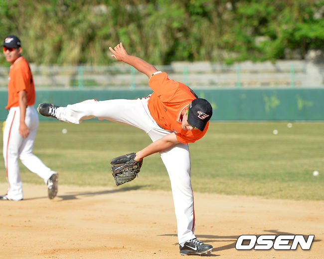 7일 오전 일본 오키나와 고친다 구장에서 한화 이글스 2014 마무리 캠프가 진행됐다. 윤규진이 펑고 훈련을 받고 있다.