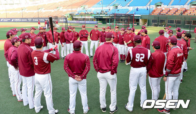 7일 오후 서울 목동야구장에서 열리는 '2014 한국야쿠르트 세븐 프로야구 포스트시즌' 삼성 라이온즈와 넥센 히어로즈의 한국시리즈 3차전, 넥센 선수들이 훈련 시작을 앞두고 미팅을 하고 있다.