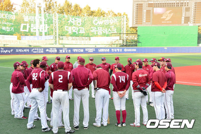 7일 오후 서울 목동야구장에서 열리는 '2014 한국야쿠르트 세븐 프로야구 포스트시즌' 삼성 라이온즈와 넥센 히어로즈의 한국시리즈 3차전, 넥센 선수들이 훈련 시작을 앞두고 미팅을 하고 있다.