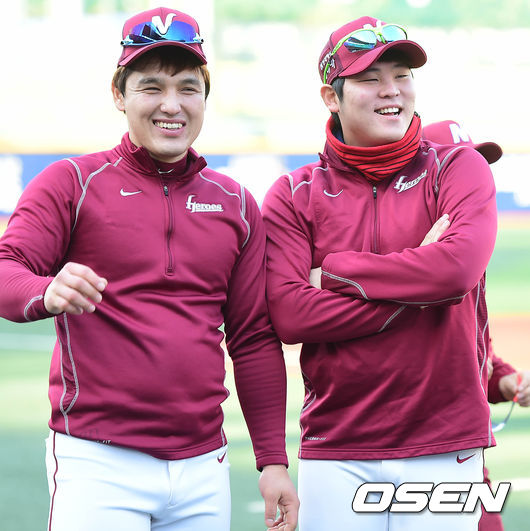 7일 오후 서울 목동야구장에서 열리는 '2014 한국야쿠르트 세븐 프로야구 포스트시즌' 삼성 라이온즈와 넥센 히어로즈의 한국시리즈 3차전, 넥센 박동원과 한현희가 대화를 나누며 미소짓고 있다.