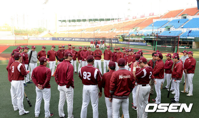 7일 오후 서울 목동야구장에서 열린 '2014 한국야쿠르트 세븐 프로야구 포스트시즌' 삼성 라이온즈와 넥센 히어로즈의 한국시리즈 3차전, 경기에 앞서 넥센 선수단이 미팅을 하고 있다.