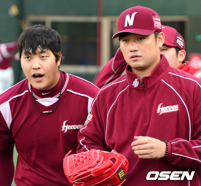 7일 오후 서울 목동야구장에서 열린 '2014 한국야쿠르트 세븐 프로야구 포스트시즌' 삼성 라이온즈와 넥센 히어로즈의 한국시리즈 3차전, 경기에 앞서 넥센 조상우, 손승락, 한현희가 훈련을 하고 있다.