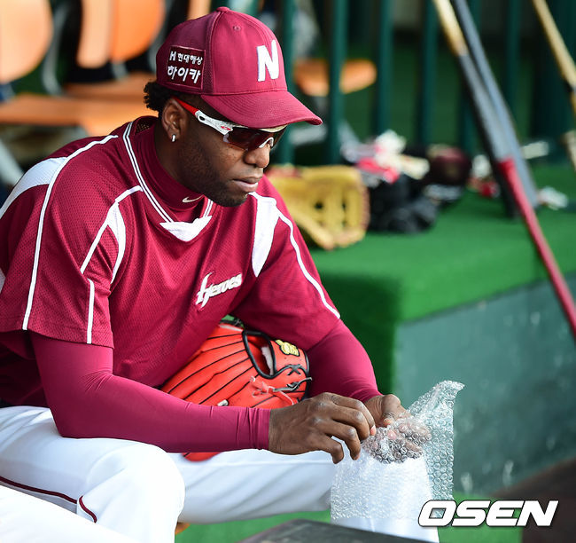7일 오후 서울 목동야구장에서 열리는 '2014 한국야쿠르트 세븐 프로야구 포스트시즌' 삼성 라이온즈와 넥센 히어로즈의 한국시리즈 3차전, 넥센 소사가 포장완충재를 가지고 장난을 치고 있다.