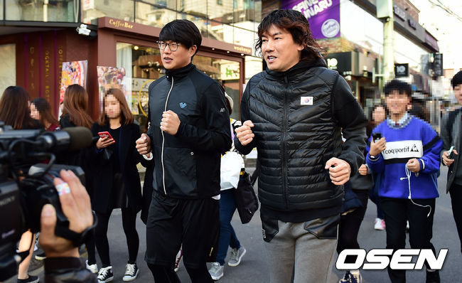 가수 김장훈과 성시경이 뮤직비디오 촬영을 위해 거리 달리기를 하고 있다.