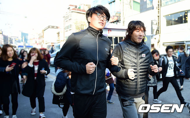 가수 김장훈과 성시경이 뮤직비디오 촬영을 위해 거리 달리기를 하고 있다.
