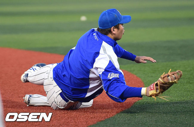 7일 오후 서울 목동야구장에서 열린 '2014 한국야쿠르트 세븐 프로야구 포스트시즌' 삼성 라이온즈와 넥센 히어로즈의 한국시리즈 3차전에 앞서 삼성 채태인이 수비 연습을 하고 있다.