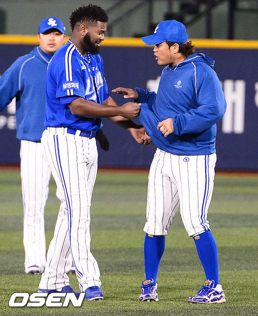 7일 오후 서울 목동야구장에서 열린 '2014 한국야쿠르트 세븐 프로야구 포스트시즌' 넥센 히어로즈와 삼성 라이온즈의 한국시리즈 3차전 경기에 앞서 삼성 나바로와 박석민이 장난을 치고 있다.