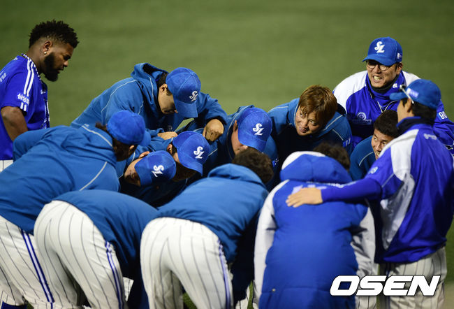 7일 오후 서울 목동야구장에서 열린 '2014 한국야쿠르트 세븐 프로야구 포스트시즌' 넥센 히어로즈와 삼성 라이온즈의 한국시리즈 3차전, 경기에 앞서 삼성 선수들이 파이팅을 하고 있다.