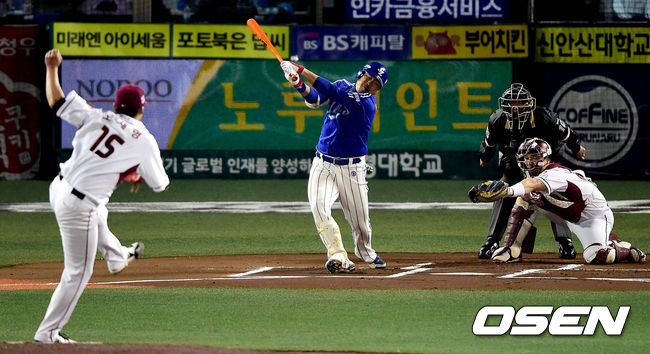 1회초 삼성 공격 1사 주자없는 상황 박한이가 넥센 선발 오재영의 공에 헛스윙 삼진을 당하고 있다.