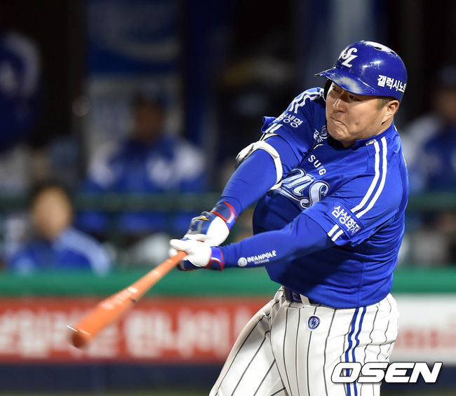 7일 오후 서울 목동야구장에서 열린 '2014 한국야쿠르트 세븐 프로야구 포스트시즌' 넥센 히어로즈와 삼성 라이온즈의 한국시리즈 3차전, 1회말 2사 1루 최형우가 2루타를 치고 있다.