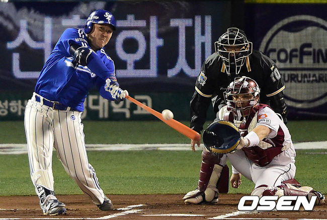 1회초 삼성 공격 2사 1루 상황 최형우가 우익수 방면 2루타를 날리고 있다.