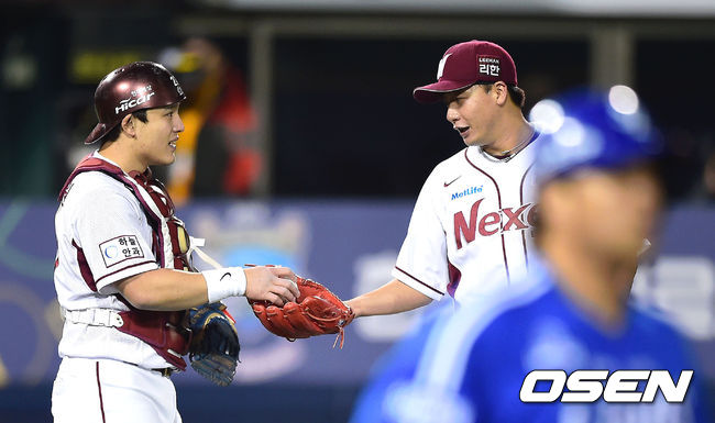 7일 오후 서울 목동야구장에서 열린 '2014 한국야쿠르트 세븐 프로야구 포스트시즌' 넥센 히어로즈와 삼성 라이온즈의 한국시리즈 3차전 경기,1회초 2사 2,3루 삼성 박석민에게 볼넷을 허용한 넥센 선발투수 오재영이 박동원 포수와 이야기를 나누고 있다.