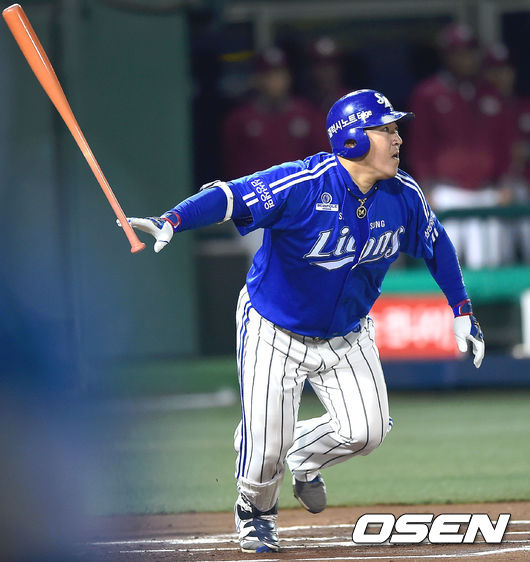 7일 오후 서울 목동야구장에서 열린 '2014 한국야쿠르트 세븐 프로야구 포스트시즌' 넥센 히어로즈와 삼성 라이온즈의 한국시리즈 3차전 경기,1회초 2사 1루 삼성 최형우가 2루타를 날리고 있다.