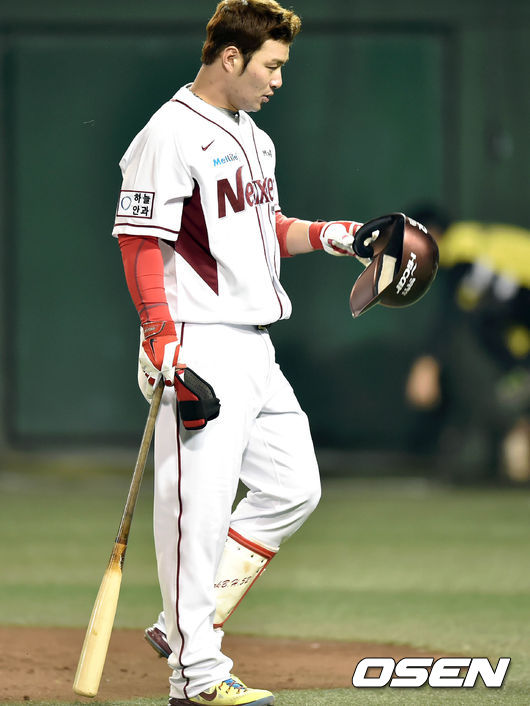 7일 오후 서울 목동야구장에서 열린 '2014 한국야쿠르트 세븐 프로야구 포스트시즌' 넥센 히어로즈와 삼성 라이온즈의 한국시리즈 3차전,1회말 2사 1루 박병호가 헛스윙 삼진으로 물러나고 있다.