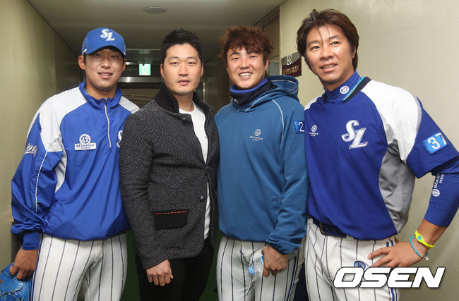 7일 오후 서울 목동야구장에서 열린 '2014 한국야쿠르트 세븐 프로야구 포스트시즌' 삼성 라이온즈와 넥센 히어로즈의 한국시리즈 3차전에 앞서 한신 타이거즈 오승환이 경기장을 찾아 삼성 윤성환, 안지만, 임창용과 기념촬영을 하고 있다.