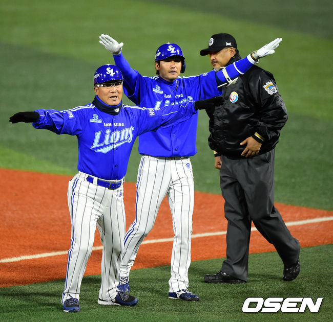 7일 오후 서울 목동야구장에서 열린 '2014 한국야쿠르트 세븐 프로야구 포스트시즌' 넥센 히어로즈와 삼성 라이온즈의 한국시리즈 3차전, 2회초 2사에서 삼성 김상수가 스트라이크 낫아웃에 1루에서 아웃을 당하고 세이프라며 합의 판정을 요청하고 있다. 합의 판정 결과 세이프.
