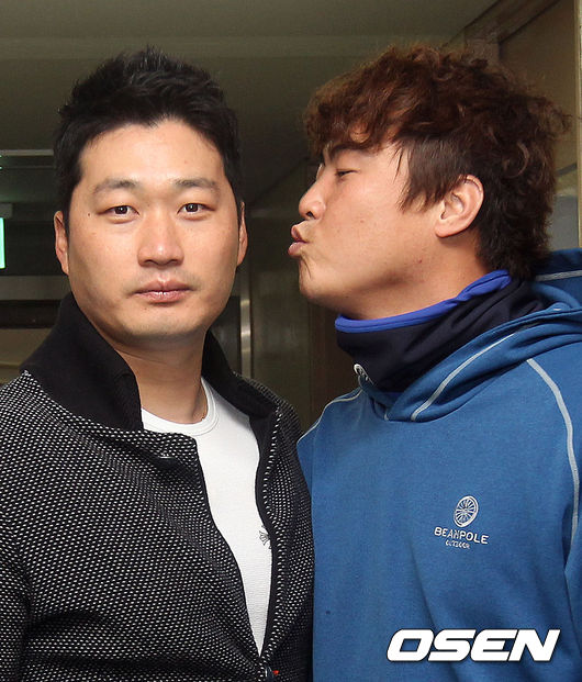 7일 오후 서울 목동야구장에서 열린 '2014 한국야쿠르트 세븐 프로야구 포스트시즌' 삼성 라이온즈와 넥센 히어로즈의 한국시리즈 3차전에 앞서 한신 타이거즈 오승환이 경기장을 찾아 삼성 안지만과 기념촬영을 하고 있다.