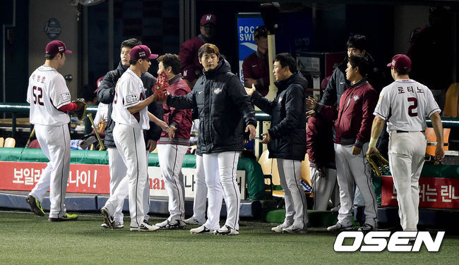 2회초 삼성 공격 2사 1루 상황 나바로를 내야 땅볼로 이끌며 무실점으로 이닝을 마친 넥센 선발 오재영이 더그아웃으로 들어오며 동료들과 인사를 나누고 있다.