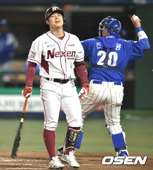 7일 오후 서울 목동야구장에서 열린 '2014 한국야쿠르트 세븐 프로야구 포스트시즌' 넥센 히어로즈와 삼성 라이온즈의 한국시리즈 3차전, 2회말 2사 윤석민이 루킹 삼진을 당하고 아쉬워하고 있다.