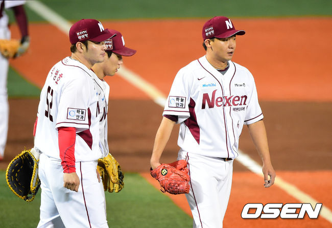 7일 오후 서울 목동야구장에서 열린 '2014 한국야쿠르트 세븐 프로야구 포스트시즌' 넥센 히어로즈와 삼성 라이온즈의 한국시리즈 3차전, 2회초 2사에서 삼성 김상수가 스트라이크 낫아웃에 1루에서 아웃을 당하고 세이프라며 합의 판정을 요청하자 넥센 오재영, 박병호가 그라운드에 다시 들어서고 있다. 합의 판정 결과 세이프.