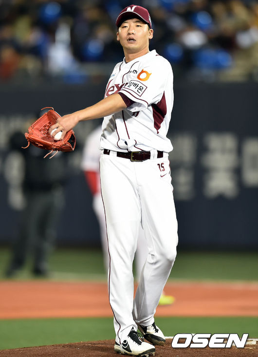 7일 오후 서울 목동야구장에서 열린 '2014 한국야쿠르트 세븐 프로야구 포스트시즌' 넥센 히어로즈와 삼성 라이온즈의 한국시리즈 3차전, 마운드에 오른 오재영이 몸을 풀고 있다.
