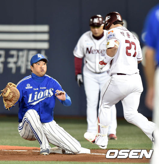 7일 오후 서울 목동야구장에서 열린 '2014 한국야쿠르트 세븐 프로야구 포스트시즌' 넥센 히어로즈와 삼성 라이온즈의 한국시리즈 3차전, 3회말 1사 박동원의 스트라이크아웃 낫아웃 상황에서 송구가 원바운드로 오자 채태인 1루수가 놀란 표정을 짓고 있다.