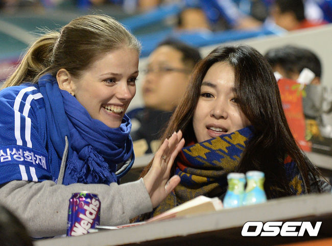 7일 오후 서울 목동야구장에서 열린 '2014 한국야쿠르트 세븐 프로야구 포스트시즌' 넥센 히어로즈와 삼성 라이온즈의 한국시리즈 3차전, 삼성 밴덴헐크 아내 애나가 경기장을 찾아 박한이 아내 조명진씨와 인사를 나누고 있다.