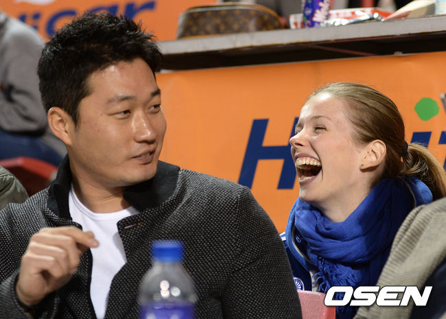 7일 오후 서울 목동야구장에서 열린 '2014 한국야쿠르트 세븐 프로야구 포스트시즌' 넥센 히어로즈와 삼성 라이온즈의 한국시리즈 3차전, 삼성 밴덴헐크 아내 애나가 경기장을 찾아 한신 타이거즈 오승환과 인사를 나누고 있다.