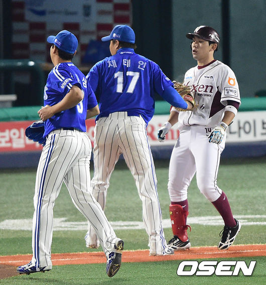 3회말 넥센 공격 2사 주자없는 상황 삼성 1루수 채태인이 서건창의 내야 땅볼 타구를 잡아 직접 태그아웃 시키고 있다.