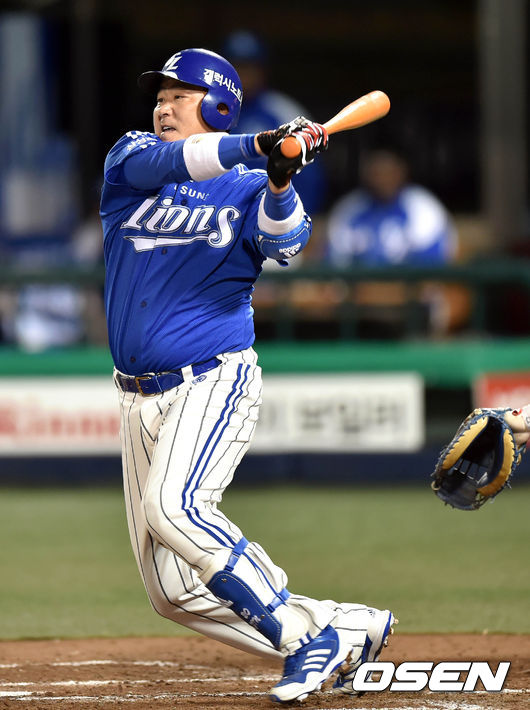 7일 오후 서울 목동야구장에서 열린 '2014 한국야쿠르트 세븐 프로야구 포스트시즌' 넥센 히어로즈와 삼성 라이온즈의 한국시리즈 3차전,4회초 2사 1루 진갑용이 안타를 치고 있다.