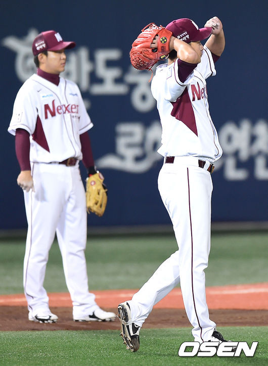7일 오후 서울 목동야구장에서 열린 '2014 한국야쿠르트 세븐 프로야구 포스트시즌' 넥센 히어로즈와 삼성 라이온즈의 한국시리즈 3차전 경기,4회초 2사 1,2루 삼성 김상수의 타석때 송구실책으로 2루 주자를 진루시킨 넥센 선발 오재영이 아쉬워하고 있다.