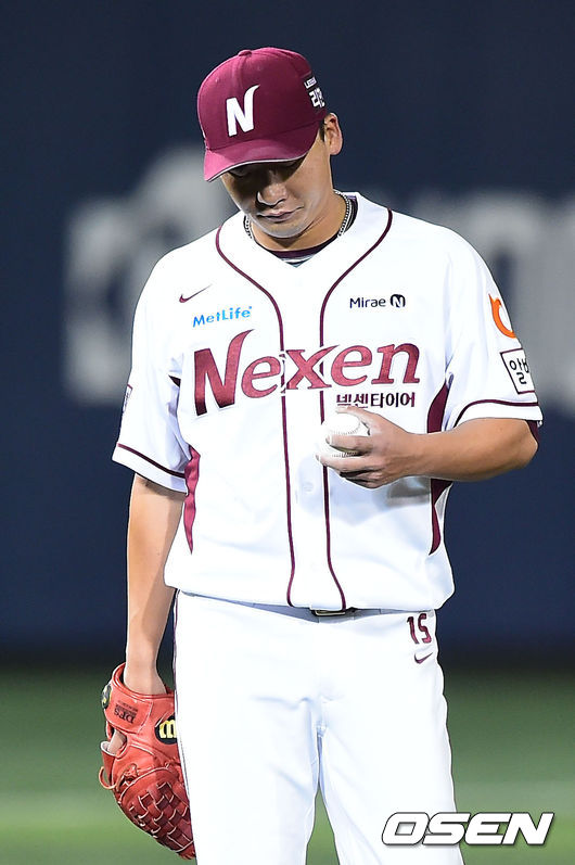 7일 오후 서울 목동야구장에서 열린 '2014 한국야쿠르트 세븐 프로야구 포스트시즌' 넥센 히어로즈와 삼성 라이온즈의 한국시리즈 3차전 경기,4회초 2사 1,2루 삼성 김상수의 타석때 송구실책으로 2루 주자를 3루까지 진루시킨 넥센 선발 오재영이 아쉬워하고 있다.