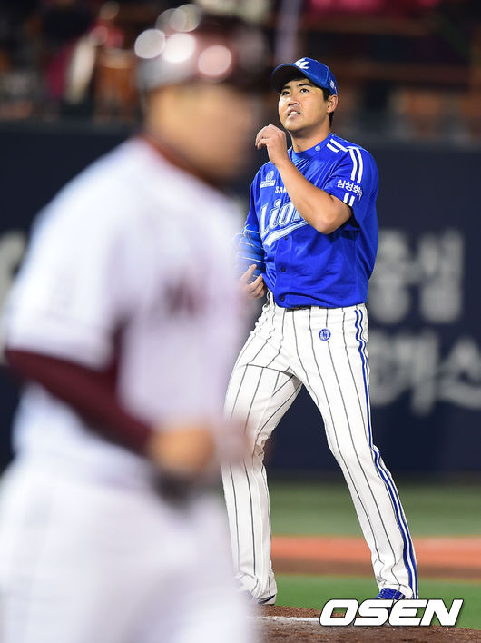 7일 오후 서울 목동야구장에서 열린 '2014 한국야쿠르트 세븐 프로야구 포스트시즌' 넥센 히어로즈와 삼성 라이온즈의 한국시리즈 3차전 경기,4회말 2사 1루 넥센 강정호에게 볼넷을 허용한 삼성 장원삼 선발투수가 아쉬워하고 있다.