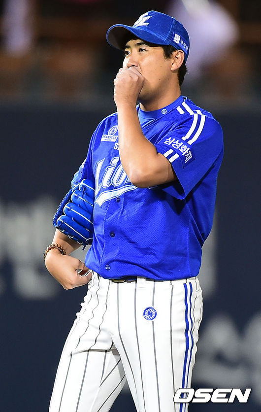 7일 오후 서울 목동야구장에서 열린 '2014 한국야쿠르트 세븐 프로야구 포스트시즌' 넥센 히어로즈와 삼성 라이온즈의 한국시리즈 3차전 경기,4회초 삼성 선발투수 장원삼이손에 입김을 불고 있다.