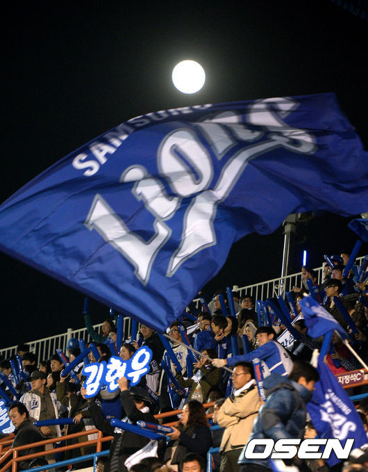 7일 오후 서울 목동야구장에서 열린 '2014 한국야쿠르트 세븐 프로야구 포스트시즌' 넥센 히어로즈와 삼성 라이온즈의 한국시리즈 3차전, 삼성 팬들이 열띤 응원을 하고 있다.