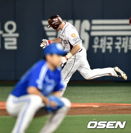 7일 오후 서울 목동야구장에서 열린 '2014 한국야쿠르트 세븐 프로야구 포스트시즌' 넥센 히어로즈와 삼성 라이온즈의 한국시리즈 3차전, 5회말 1사 로티노가 솔로홈런을 치고 환호하고 있다.