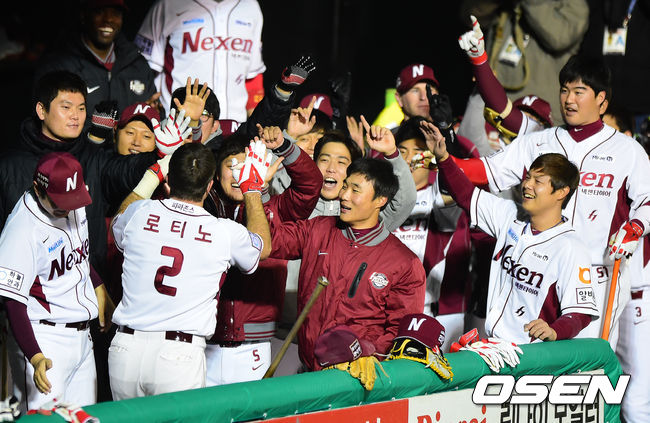 7일 오후 서울 목동야구장에서 열린 '2014 한국야쿠르트 세븐 프로야구 포스트시즌' 넥센 히어로즈와 삼성 라이온즈의 한국시리즈 3차전, 5회말 1사에서 넥센 로티노가 선제 솔로포를 날리고 더그아웃에서 동료선수들과 기뻐하고 있다.
