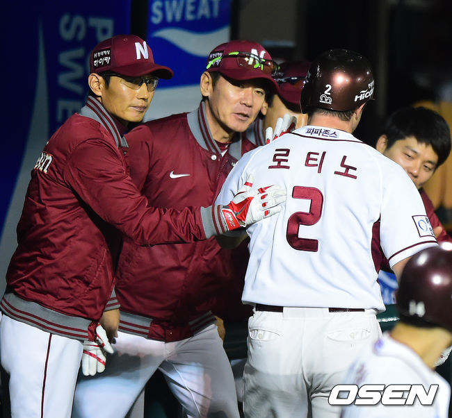 7일 오후 서울 목동야구장에서 열린 '2014 한국야쿠르트 세븐 프로야구 포스트시즌' 넥센 히어로즈와 삼성 라이온즈의 한국시리즈 3차전, 5회말 1사에서 넥센 로티노가 선제 솔로포를 날리고 염경엽 감독과 하이파이브를 하고 있다.