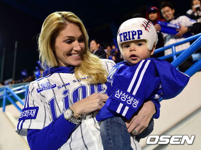 삼성 마틴 아내와 그의 아들이 취재진 카메라를 바라보고 있다.
