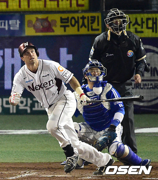 5회말 넥센 공격 1사 주자없는 상황 로티노가 삼성 선발 장원삼을 상대로 선제 좌월 솔로포를 터트리고 타구를 보며 1루로 뛰고 있다.