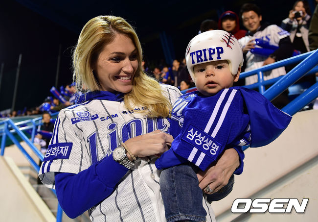삼성 마틴 아내와 그의 아들이 취재진 카메라를 바라보고 있다.