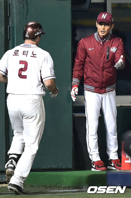7일 오후 서울 목동야구장에서 열린 '2014 한국야쿠르트 세븐 프로야구 포스트시즌' 넥센 히어로즈와 삼성 라이온즈의 한국시리즈 3차전 경기,5회말 1사 넥센 로티노가 선취 솔로홈런을 날리고 염경엽 감독과 하이파이브를 하고 있다.