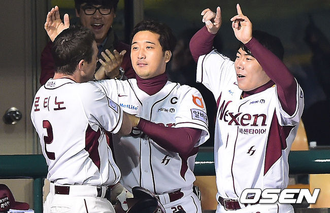 7일 오후 서울 목동야구장에서 열린 '2014 한국야쿠르트 세븐 프로야구 포스트시즌' 넥센 히어로즈와 삼성 라이온즈의 한국시리즈 3차전 경기,5회말 1사 넥센 로티노가 선취 솔로홈런을 날리고 동료들의 축하를 받고 있다.