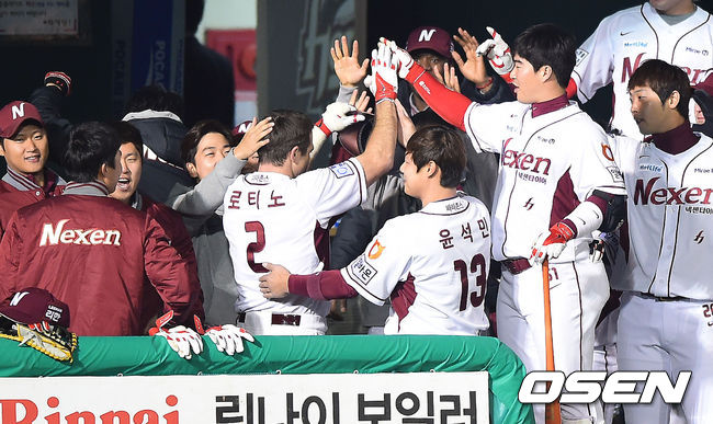 7일 오후 서울 목동야구장에서 열린 '2014 한국야쿠르트 세븐 프로야구 포스트시즌' 넥센 히어로즈와 삼성 라이온즈의 한국시리즈 3차전 경기,5회말 1사 넥센 로티노가 선취 솔로홈런을 날리고 동료들의 축하를 받고 있다.